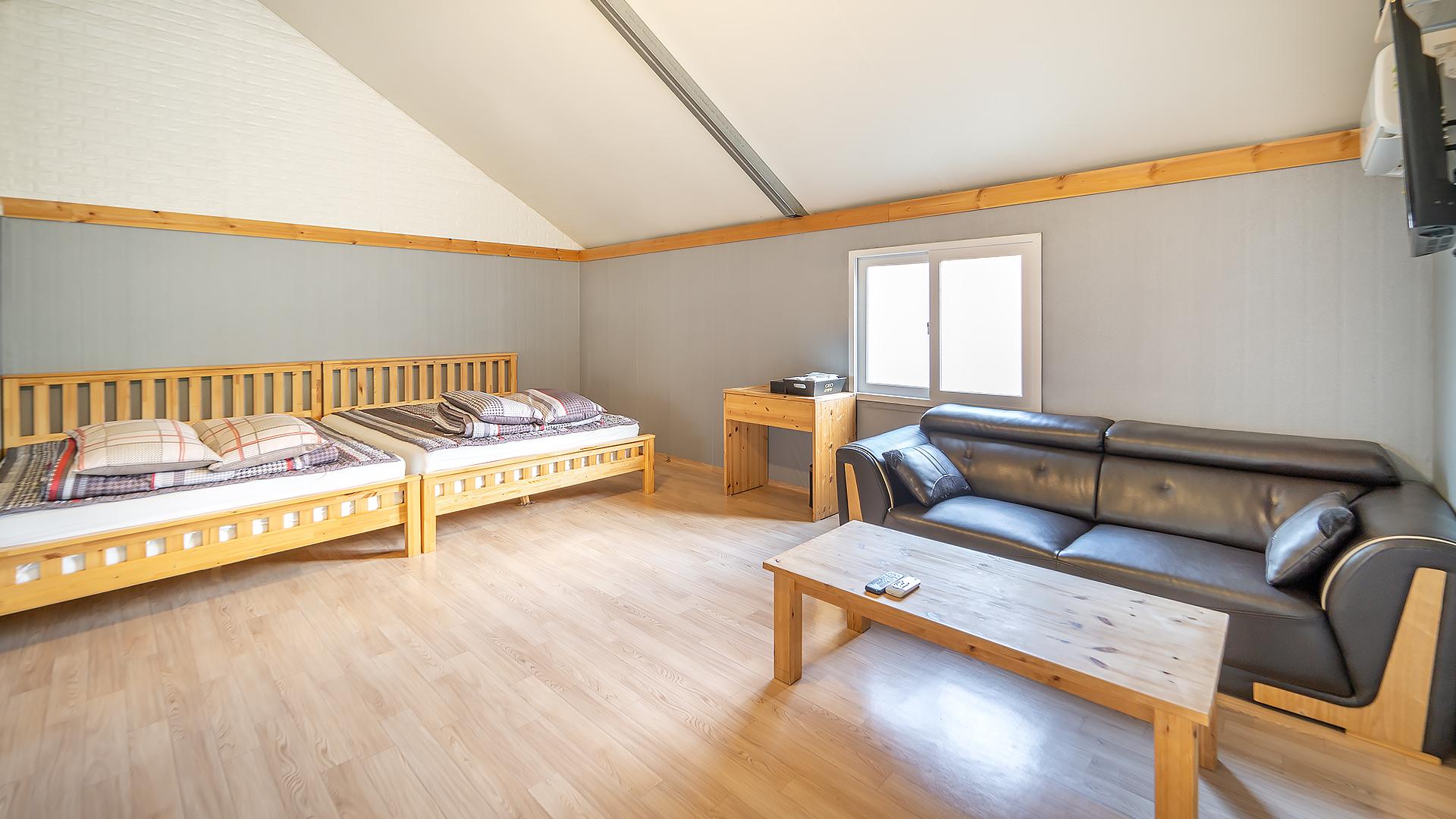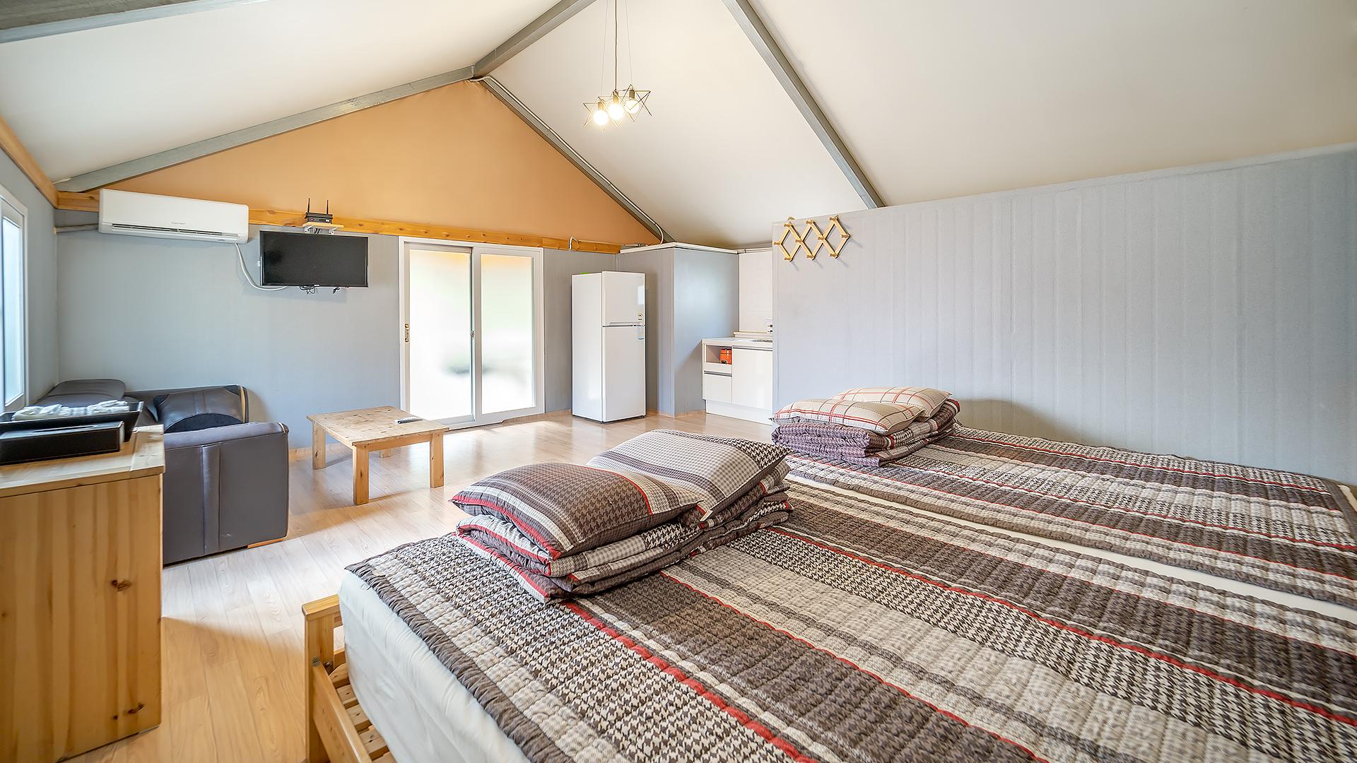 - 집기품목 : TV, 개별바비큐, 냉장고, 취사시설/도구, 커피포트, 전기밥솥, 전자레인지, 와이파이, 에어컨, 테라스, 드라이기, 화장대, 침대방, 트윈베드, VOD, 히노끼, 글램핑, 욕실용품